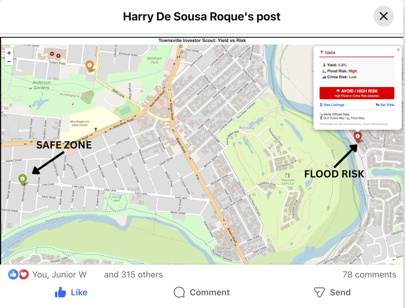 • 🔴 Red Pins (High Risk Factors): Areas flagged for historic Flood Risk (based on 2019 data) or High Crime rates.